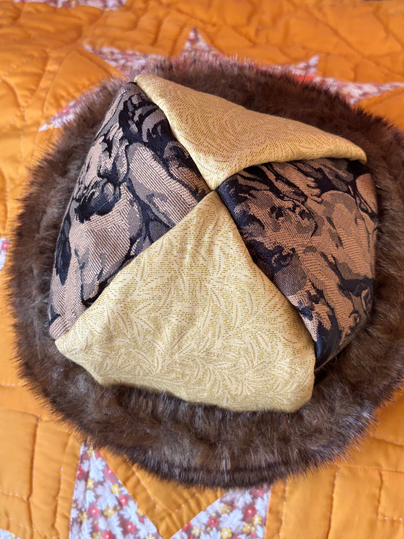 quilt hat handmade with vintage and new materials + faux fur.